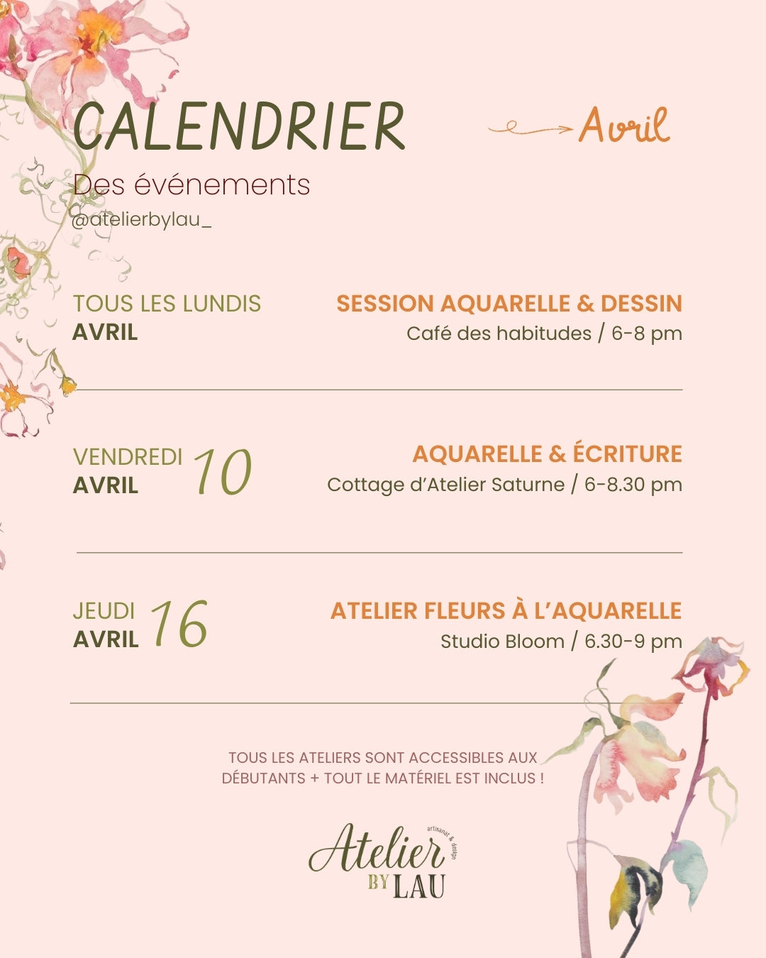 LES ATELIERS SONT ACCESSIBLES AUX DÉBUTANTS ET TOUT LE MATÉRIEL EST INCLUS 💛