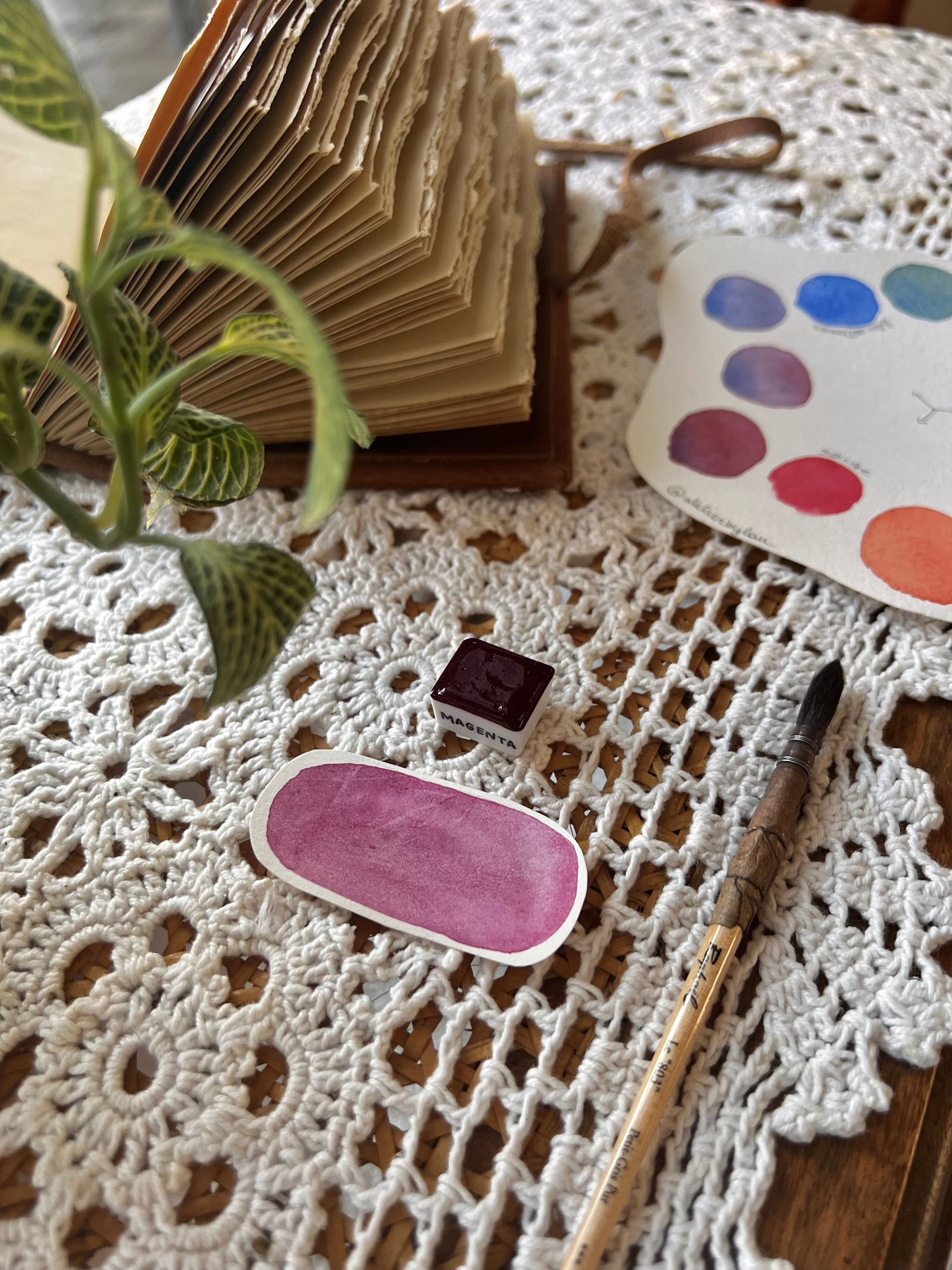 Discover one of the four essential basic colors with Magenta Artisan Watercolor, handcrafted in my Montreal studio for bold and expressive works.