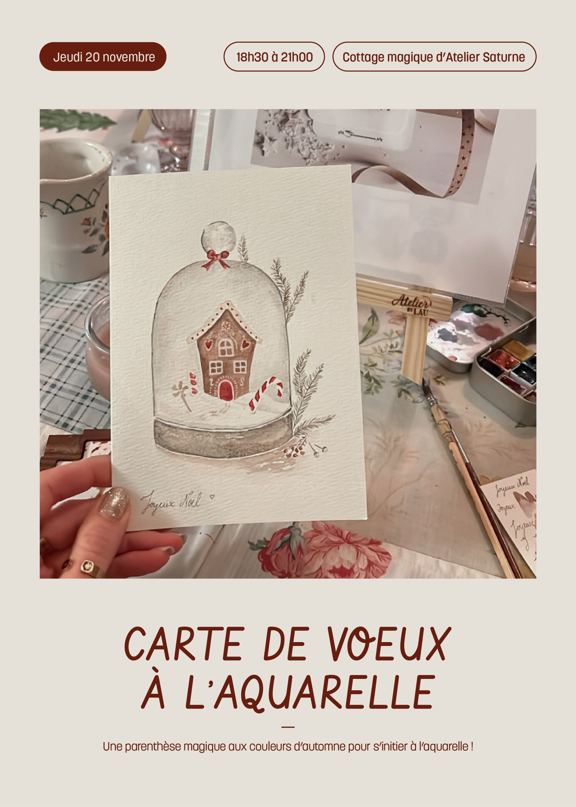 L’automne laisse doucement place à la féérie des Fêtes au Cottage magique d’Atelier Saturne… et pour l’occasion, je t’invite à une soirée créative pour apprendre les bases de l’aquarelle tout en réalisant tes propres cartes de vœux de Noël ! 💌✨